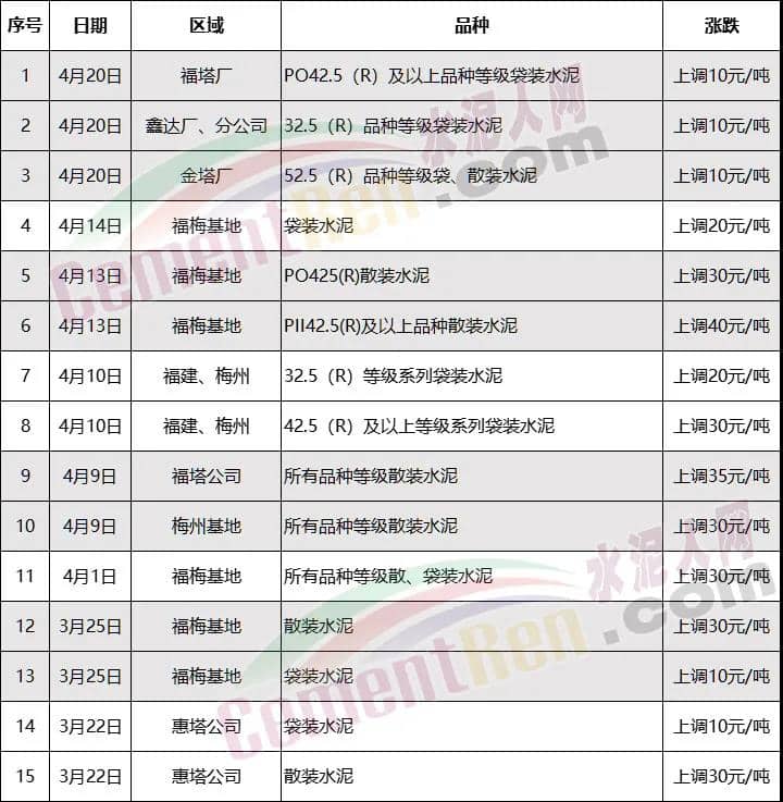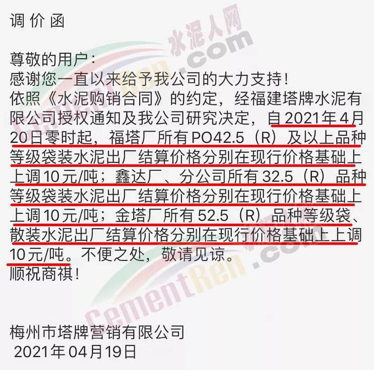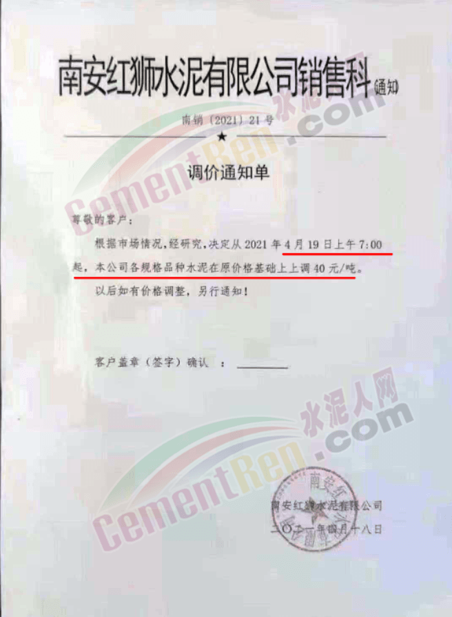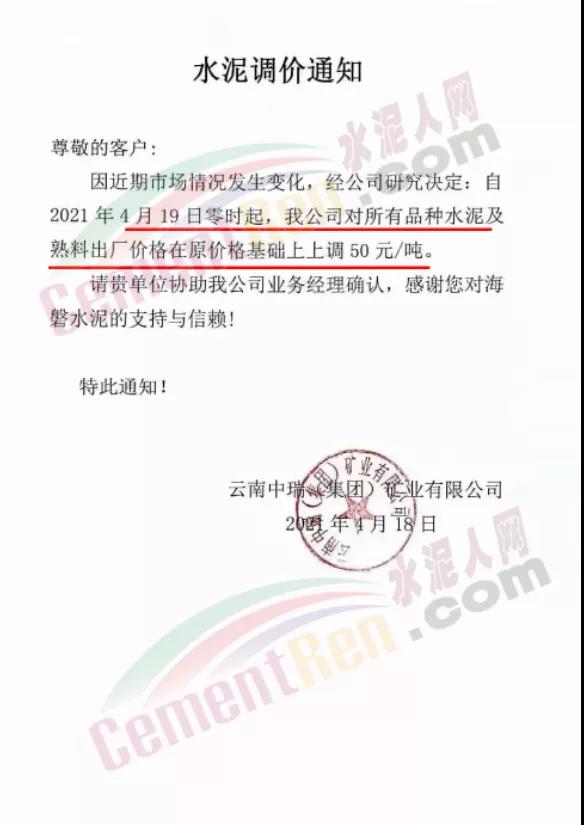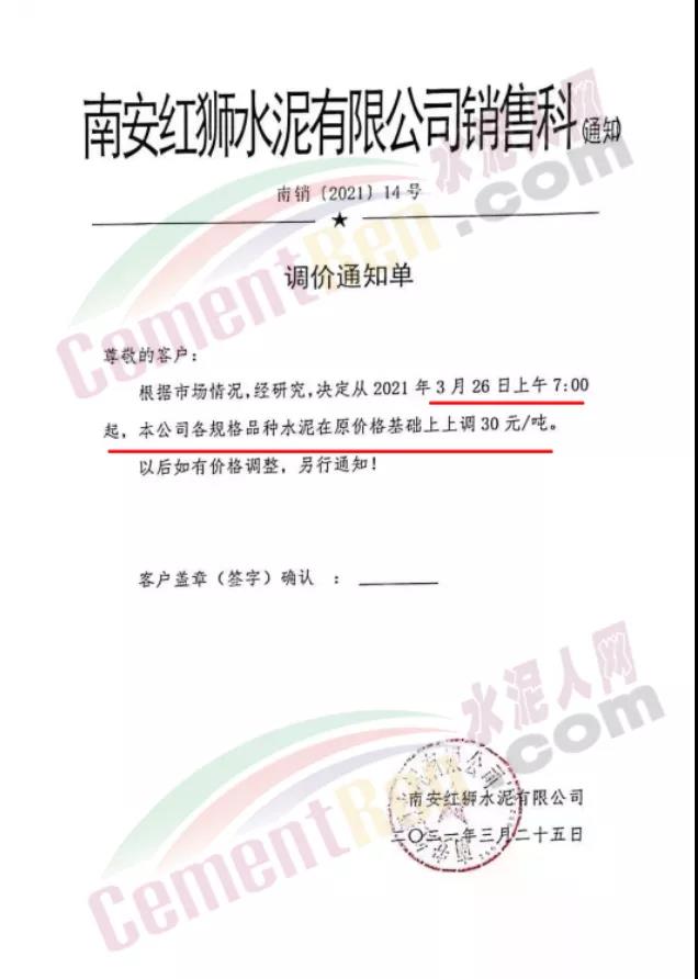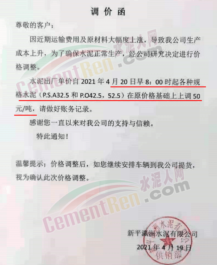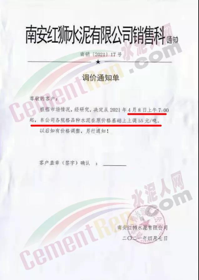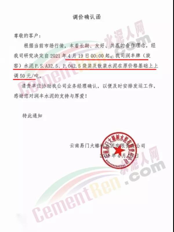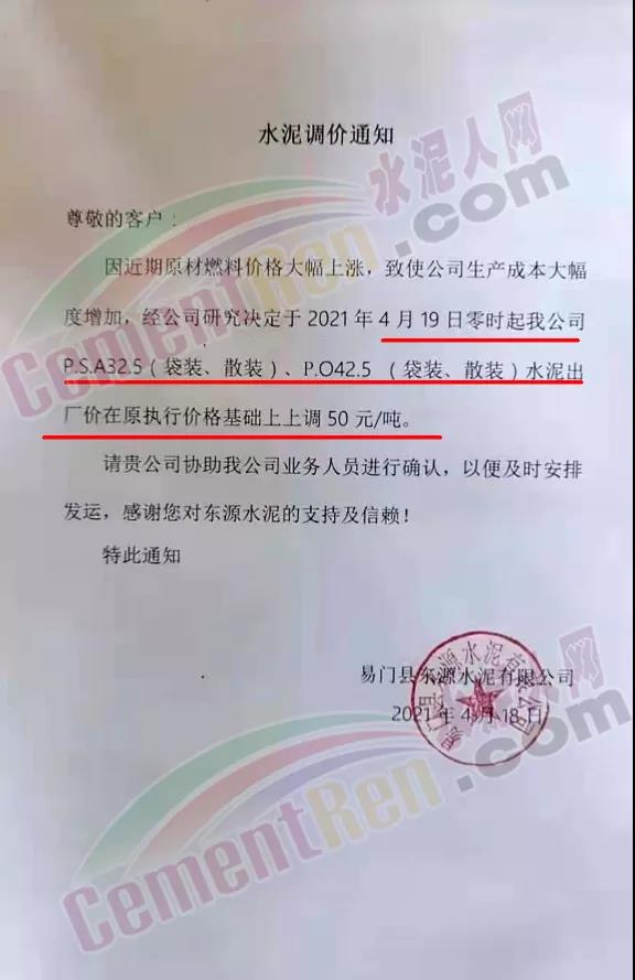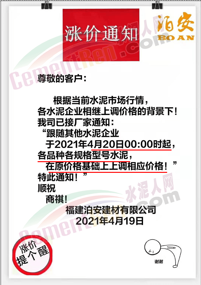 福建泊安建材通知,根据当前水泥市场行情,各水泥企业相继上调价格的背景下,公司已接厂家通知∶“跟随其他水泥企业于2021年4月20日0时起,各品种各规格型号水泥,在原价格基础上上调相应价格!”