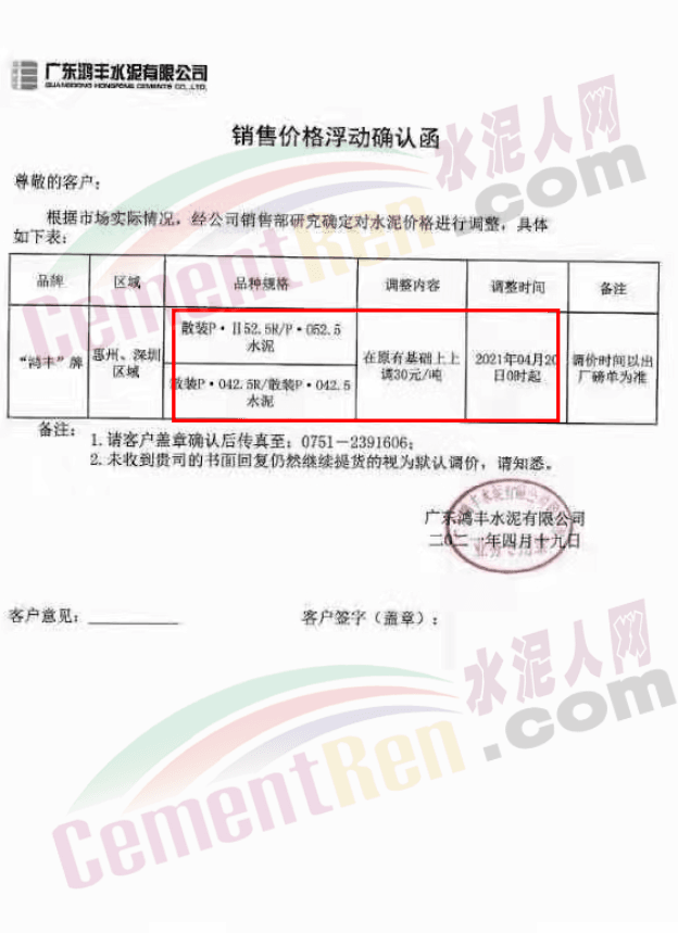 广东鸿丰水泥有限公司通知自4月20日零时起,惠州、深圳区域P.II52.5R/P.O52.5和P.O42.5R/P.O42.5散装水泥在原有基础上上调30元/吨。
