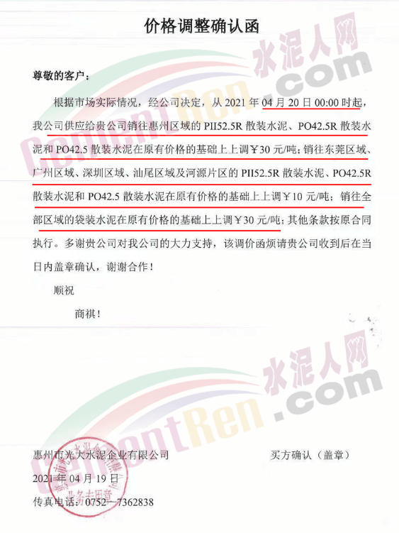 惠州光大水泥通知:从4月20日0时起: