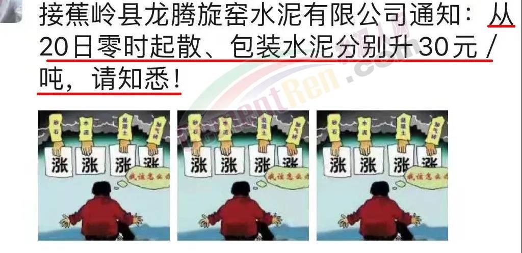 蕉岭县龙腾旋窑水泥有限公司通知∶20日零时起散、包装水泥分别上调30元/吨。
