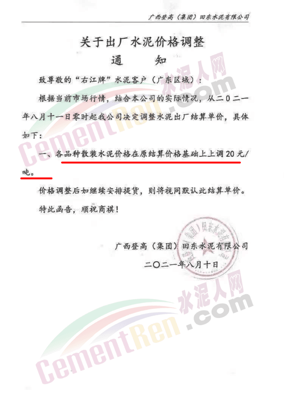 8月10日,广西登高(集团)田东水泥有限公司通知根据当前市场行情,结合公司的实际情况,从8月11日零时起公司决定调整广东区域水泥出厂结算单价。各品种散装水泥价格在原结算价格基础上上调20元/吨。价格调整后如继续安排提货。