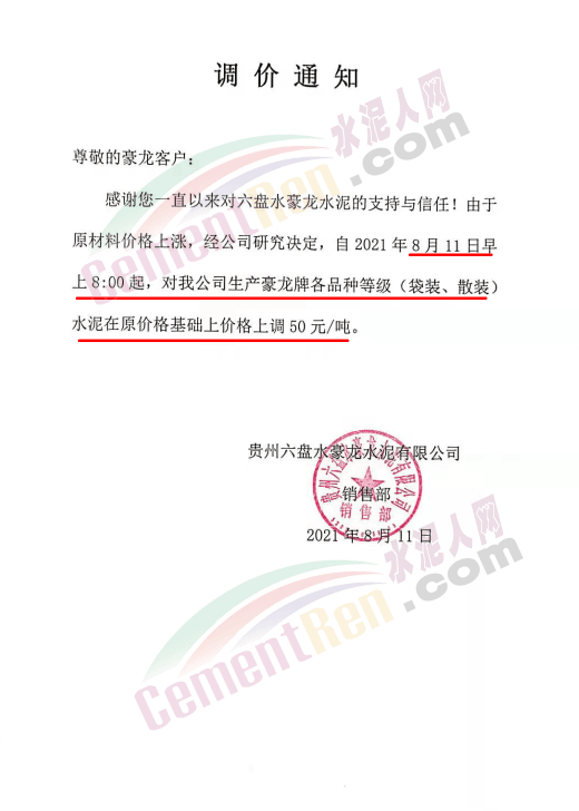 近日,受限电及煤炭涨价影响,一直处于水泥洼地的贵州省内水泥价格大幅上涨。贵州六盘水豪龙水泥有限公司通知自8月11日早8时起,对公司生产的豪龙牌各等级(袋装、散装)水泥在原价基础上上调50元/吨。