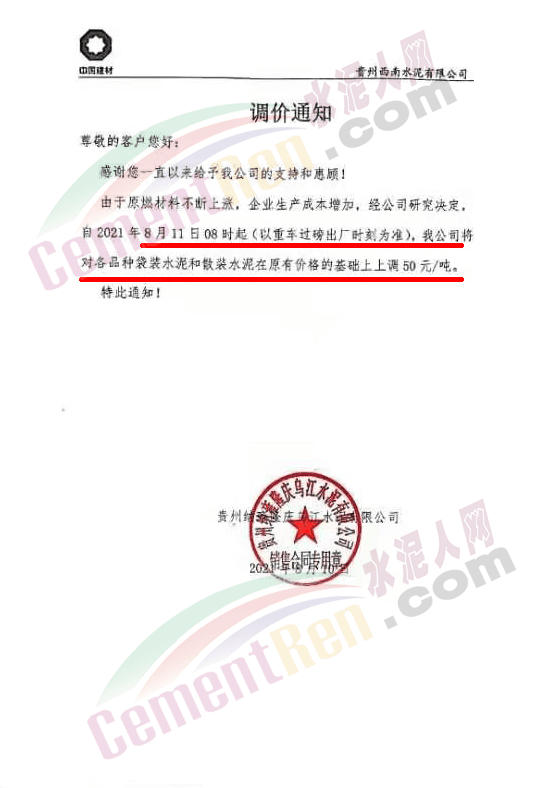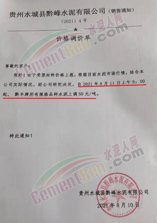 8月10日,贵州水城县黔峰水泥有限公司通知,由于受原材料价格上涨,根据目前水泥市场行情,结合本公司实际情况,经公司研究决定,自8月11日上午8时起,黔丰牌所有规格品种水泥上调50元/吨。
