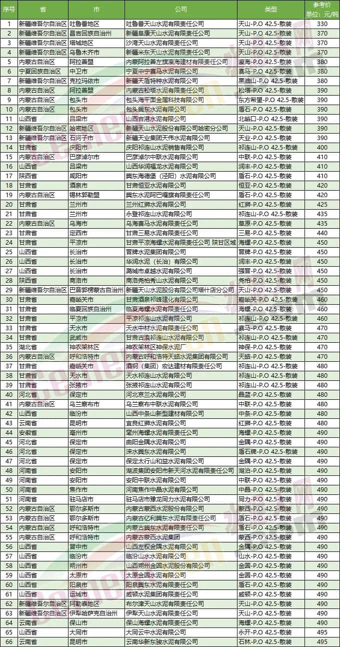 截止25日,P.O42.5散装水泥报价在500元/吨以下的企业有66家,占重点监控企业的10%以上。所覆盖区域包括宁夏、新疆、内蒙、山西、陕西、甘肃、湖北、安徽、河北、云南等省市自治区。随着各区域公转铁,铁水联运绿色物流新模式的逐步深入,北方低价水泥进入南方渐成常态。上述西北、华北区域的相对低价对南方沿江、沿海或带来一定的冲击。