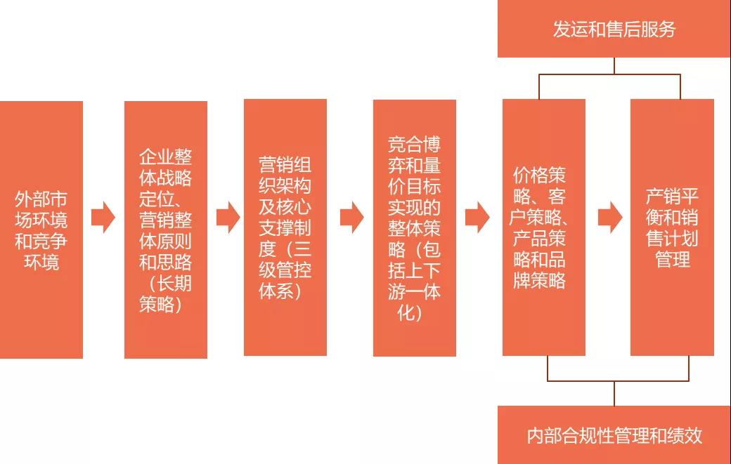 ●营销战术落地层面,包括4P方面的价格策略、客户和渠道策略、产品策略以及品牌策略等,还有与工厂协作方面的产销平衡和计划管理等等。