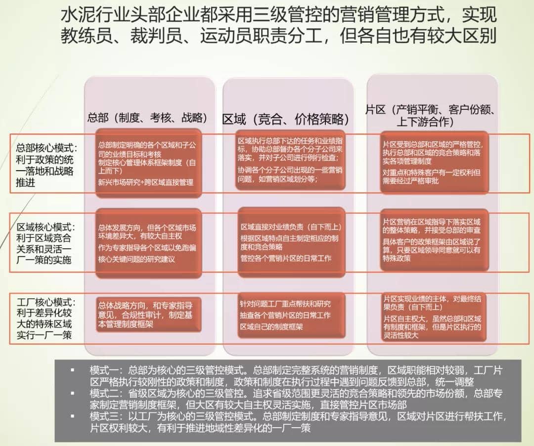 经过近20年的水泥营销实践,水泥头部企业的营销管理体系已经比较完整,普遍采用三级管控的模式。虽然因自身的市场环境和发展战略不同,它们的营销体系中保留各自的特色,但是总体上营销方法和思路非常类似。
