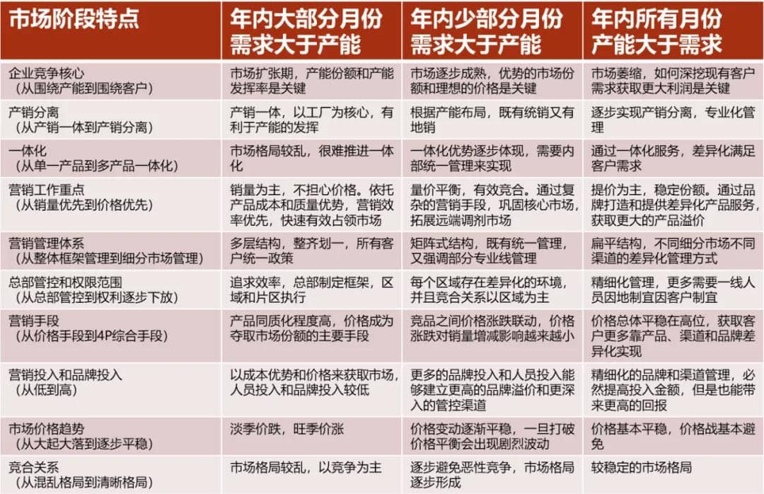 ◆水泥需求平台期,市场供求关系波动(竞合博弈阶段)。随着国家经济发展到一定阶段,各类主要的建设需求开始萎缩,水泥市场需求呈现动态波动的主要特征,波动的原因主要受到季节性气候影响或者其他短期因素影响。这个阶段的水泥市场和水泥企业的战略重心相应的会有以下五点改变。第一:此阶段的初期,很多水泥企业依然沿用扩张期的量本利的营销思路不断低价提升水泥销量,造成市场淡季水泥价格大幅度下滑,甚至跌破成本线,而市场旺季受到业绩压力的影响水泥价格又必须大幅度上升。最终水泥企业改变了在市场扩张期各自为政的状况,企业间的竞合博弈成为此阶段的水泥营销核心策略,省级区域成为水泥企业竞合博弈的主战场。第二:虽然市场需求已经进入平台期,但是产能扩张没有停滞依然惯性发展,产销矛盾和供求矛盾愈演愈烈,在中国错峰停窑成为这个时期水泥企业保障业绩最重要的政策支柱。第三:水泥企业间的比较优势从比拼产能发展速度改变为比拼产能布局,不同产能布局的企业采取不同的营销策略。布局在中西部欠发达地区的产能和散点式布局的产能因为具有区位优势营销依然采取进攻为主的策略,布局发达地区的产能和区域集中布局的产能处于劣势营销采取防守为主的策略。第四:不同的市场区域因产能布局特点不同,其竞合策略也会有很大差异。因此水泥企业总部过于严格的管理框架会束缚区域的自主权,总部逐步放权给区域是必然。第五:此阶段的中后期,经过多次竞合博弈和市场需求进一步减少,水泥企业逐步放弃原有量本利的营销策略,转而更加注重市场价格。在几乎没有新增客户的情况下,水泥企业和客户的合作关系逐渐固化,水泥市场格局逐步形成,水泥价格波动也会越来越小。