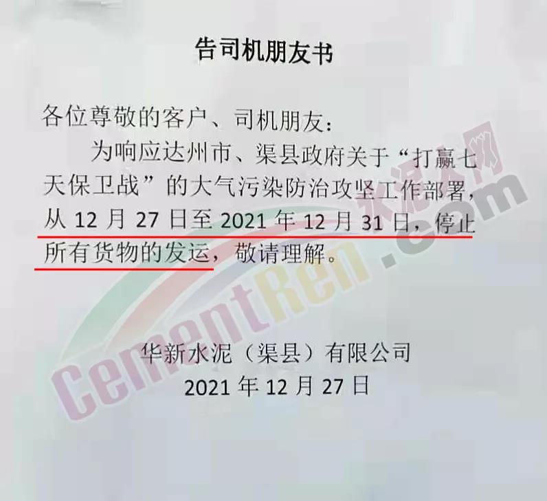 华新水泥渠县公司发布通知称,为响应达州市、渠县政府关于“打赢七天保卫战的大气污染防治攻坚工作部署”从12月27日至12月31日停止所有货物的发运。