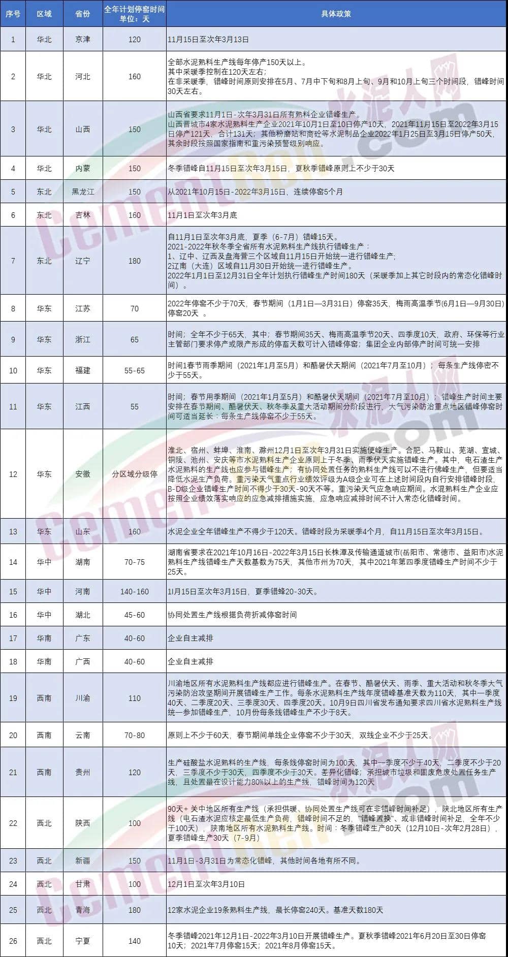 另据水泥人网近期消息,各区域水泥行业2022年错峰生产计划出台,2022年最长停产区域达180天。河北金隅鼎鑫水泥有限公司2000t/d生产线2022年非采暖季错峰30天,采暖季错峰260天,合计停产天数达290天。