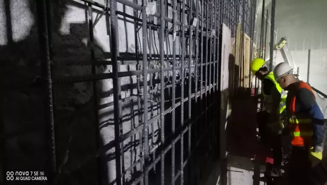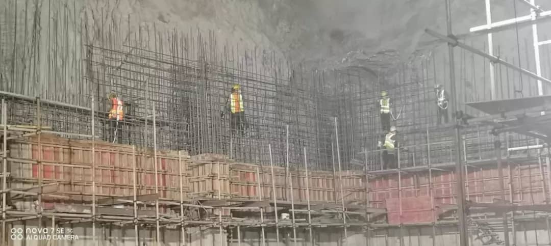 1#、2#破碎硐室是整个开拓系统工程的“咽喉”,上连主矿仓,下连皮带输送平硐,其施工质量和进度对整个开拓系统工程至关重要。破碎硐室围岩性质较差,且断面大,高度高,净高度达25米,对硐室开挖和支护带来很大困难;破碎硐室后期脚手架搭设量大,钢筋制作、绑扎量大,模板工程量大,混凝土浇筑量大,结构复杂,且作业空间受限,给土建施工带来极大的挑战。对于1#、2#破碎硐室的施工,为保证安全、质量和进度,项目部多次组织图纸会审,认真分析每个施工环节,在施工过程中合理安排施工顺序,加强组织协调,增开措施巷道,有效地保证了破碎硐室的顺利施工。