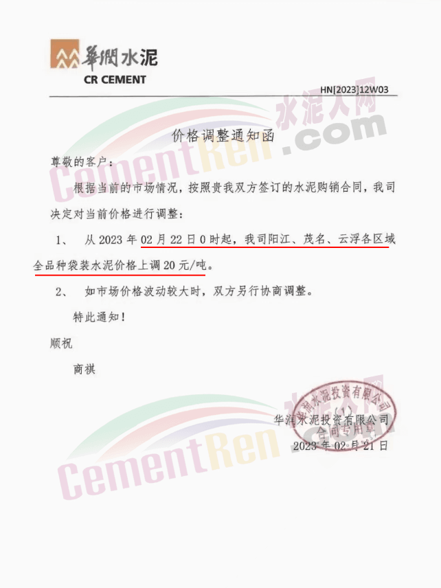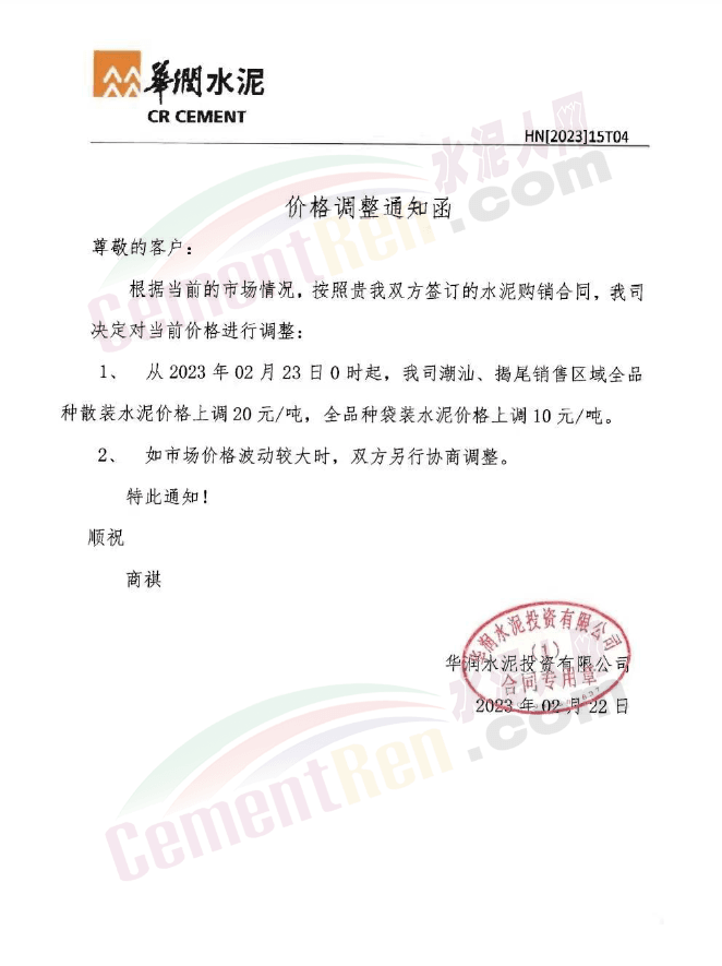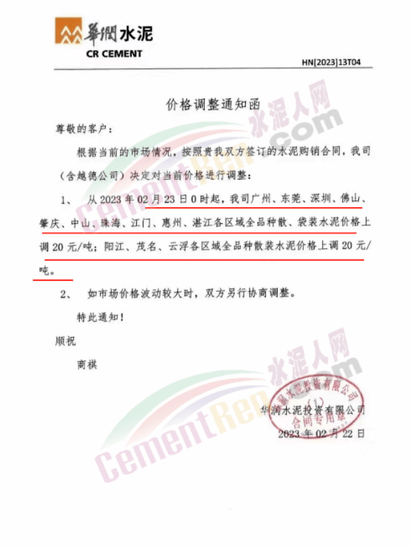 广东区域华润水泥投资有限公司从2023年2月23日0时起对发往以下的区域的水泥价格进行调整。