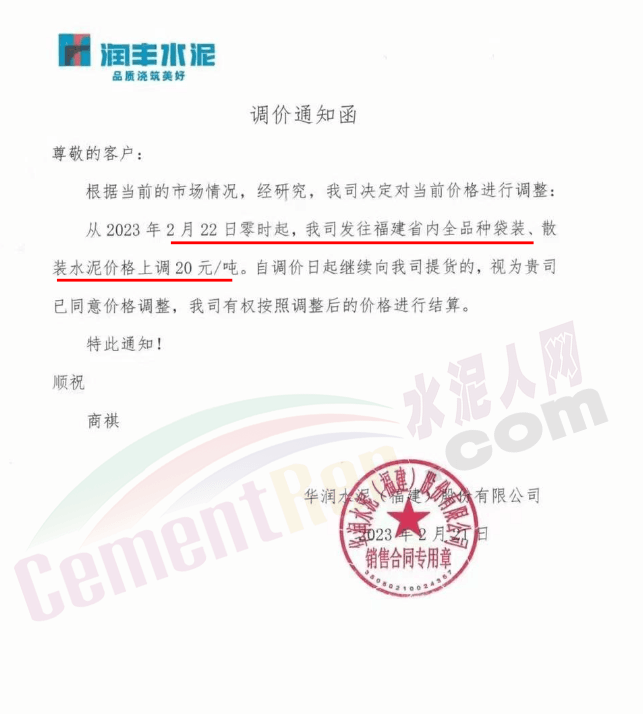 华润水泥(福建)股份有限公司通知,2月22日零时起,公司发往福建省内全品种袋装、散装水泥价格上调20元/吨。