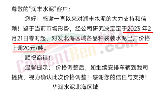 华润水泥北海区域通知,2月21日零时起,对发北海各品种袋装水泥出厂价格上调20元/吨。