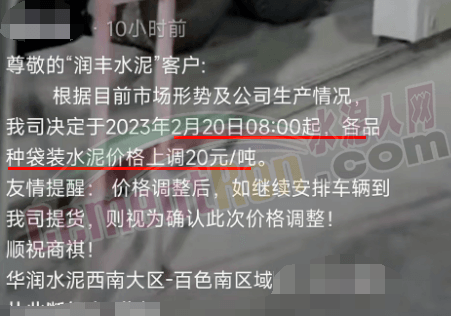 华润水泥西南大区百色南区域通知,定于2月20日8时起,各品种袋装水泥价格上调20元/吨。