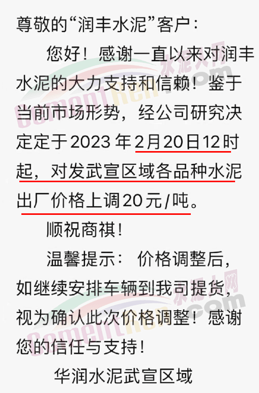 华润水泥武宣区域通知,定于2月20日12时起,对发武宣区域各品种水泥出厂价格上调20元/吨。