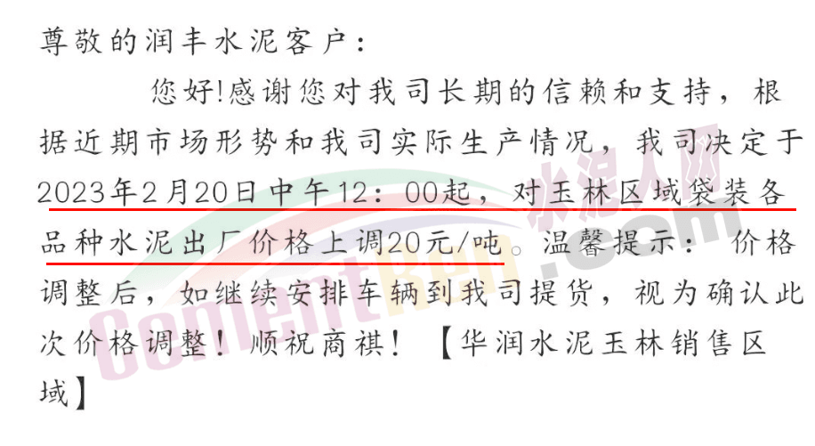 华润水泥玉林销售区通知,2月20日中午12时起,对玉林区域袋装各品种水泥价格出厂价上调20元/吨。