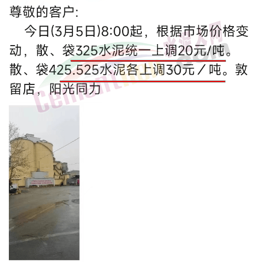 日前,河南区域阳光同力通知3月5日8时起,根据市场价格变动,散、袋32.5水泥统一上调20元/吨。散、袋42.5、52.5水泥各上调30元/吨。