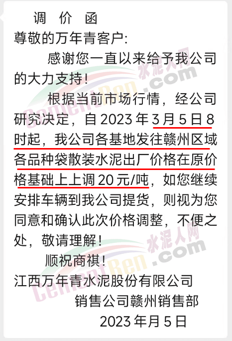 江西万年青水泥赣州销售部通知,根据当前市场行情,经公司研究决定,自2023年3月5日8时起,各基地发往赣州区域各品种袋散装水泥出厂价格在原价格基础上上调20元/吨。