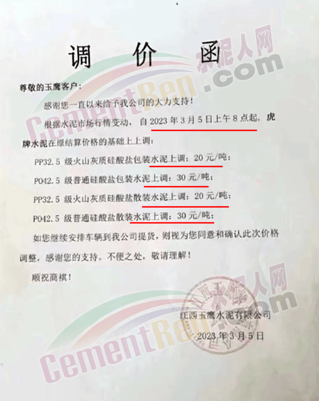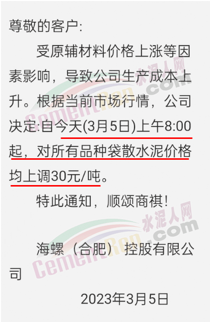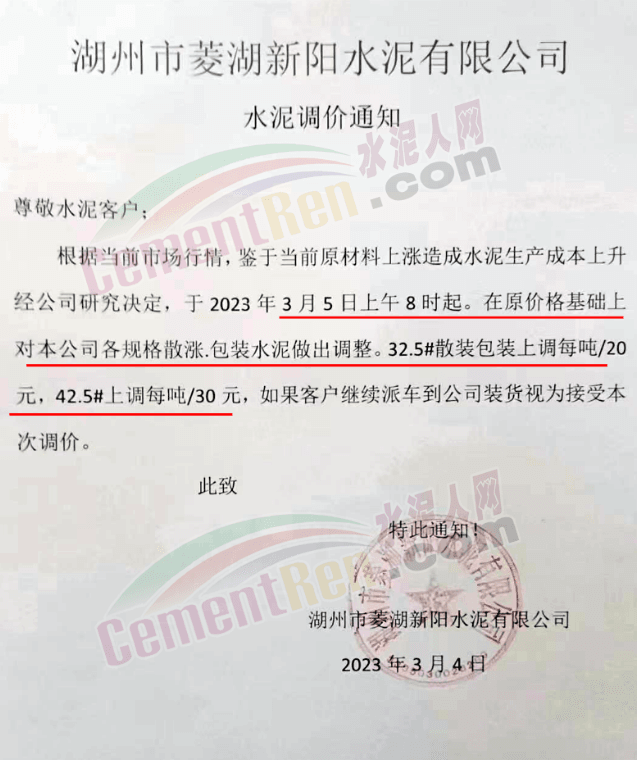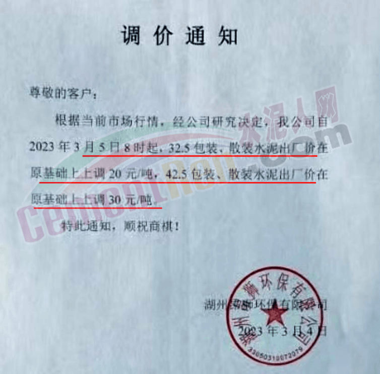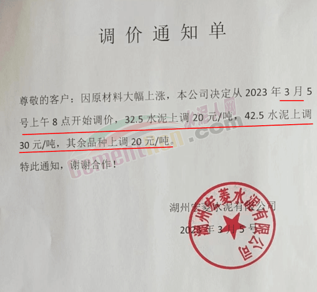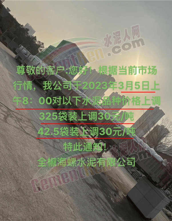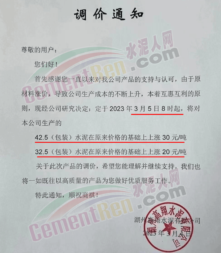湖州高翔水泥有限公司通知,由于原材料涨价,导致公司生产成本的不断上升,本着互惠互利的原则,现经公司研究决定,于2023年3月5日8时起,将对本公司生产的42.5(包装)水泥在原来价格的基础上上涨 30元/吨,325(包装)水泥在原来价格的基础上上涨20元/吨。