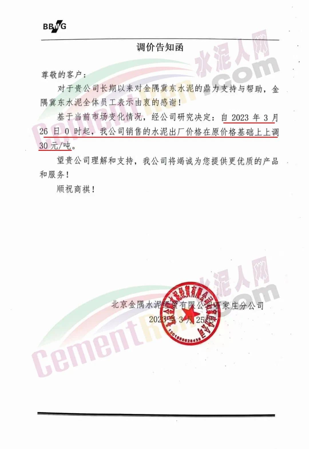 北京金隅水泥石家庄分公司通知,基于当前市场变化情况,经公司研究决定,自2023年3月26日0时起,公司销售的水泥出厂价格在原价格基础上上调30元/吨。