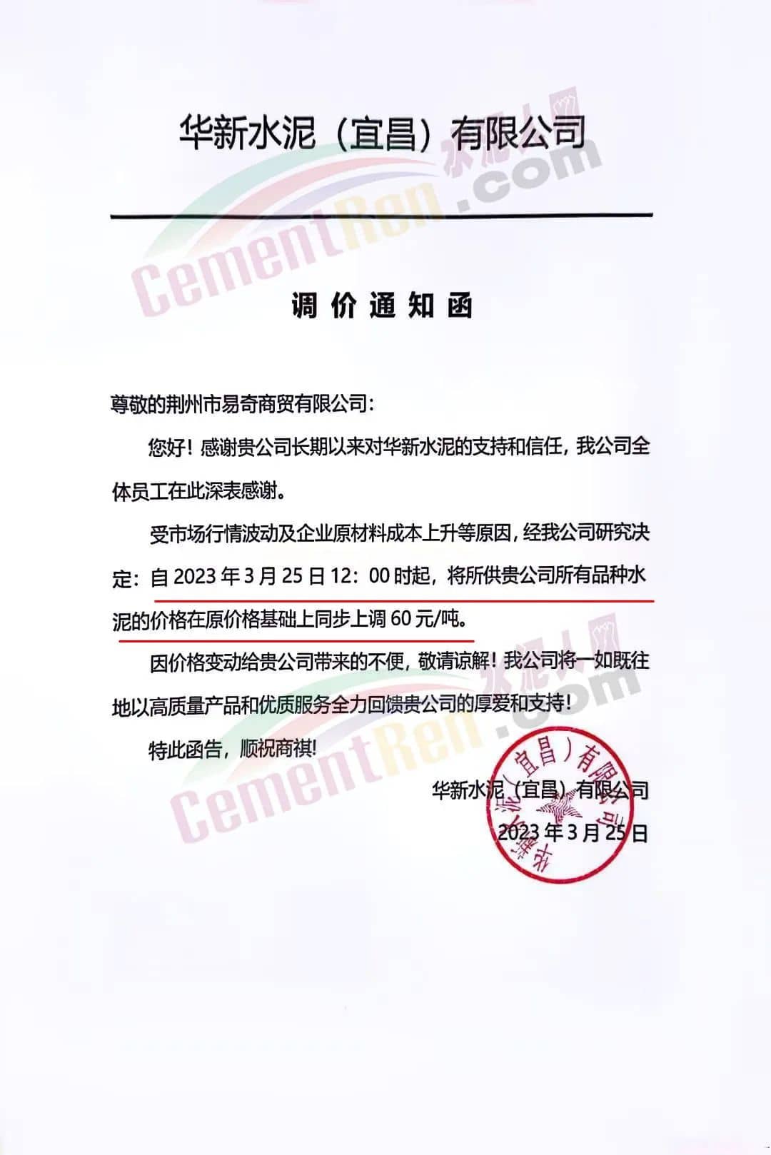 华新水泥(宜昌)有限公司通知,受市场行情波动及企业原材料成本上升等原因,经公司研究决定,自2023年3月25日12:00时起,将公司所有品种水泥的价格在原价格基础上同步上调60元/吨。