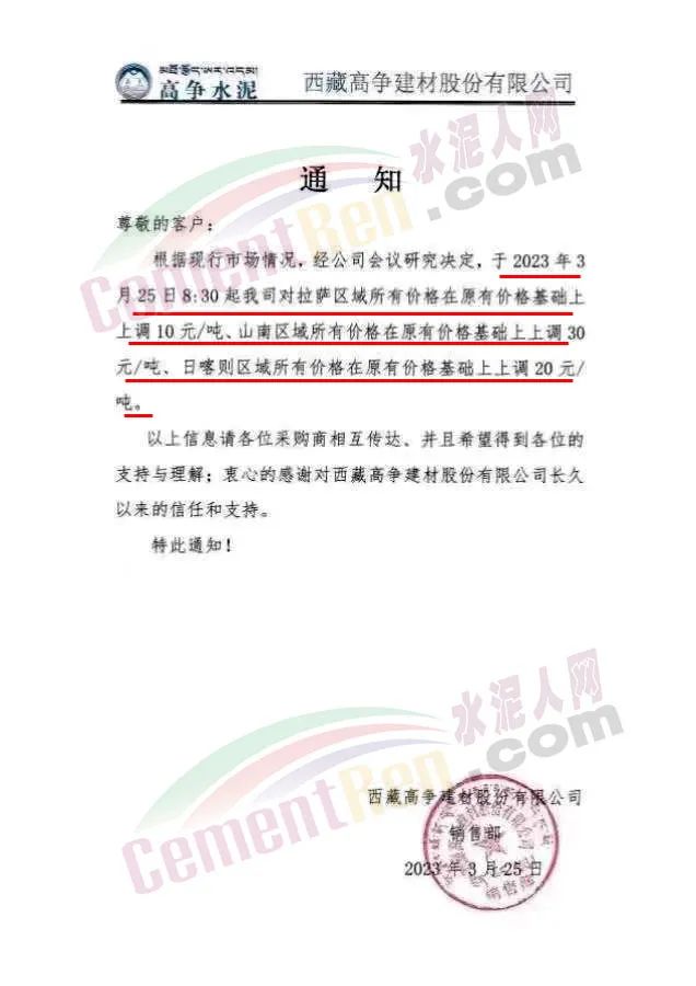 西藏高争建材股份有限公司通知,根据现行市场情况,经公司会议研究决定,于2023年3月25日8:30起公司对拉萨区域所有价格在原有价格基础上上调10元/吨;山南区域所有价格在原有价格基础上上调30元/吨、日喀则区域所有价格在原有价格基础上上调20元/吨。
