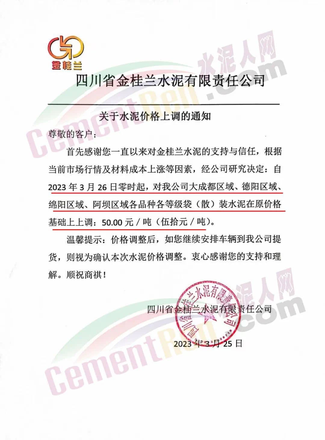 四川省金桂兰水泥有限责任公司通知,根据当前市场行情及材料成本上涨等因素,经公司研究决定,自2023年3月26日零时起,对公司大成都区域、德阳区域绵阳区域、阿坝区域各品种各等级袋(散)装水泥在原价格基础上上调50元/吨。