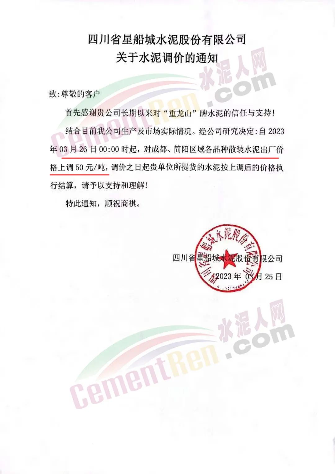 四川星船城水泥股份有限公司通知,自2023年03月26日0时起,对成都简阳区域各品种散装水泥出厂价格上调50元/吨。