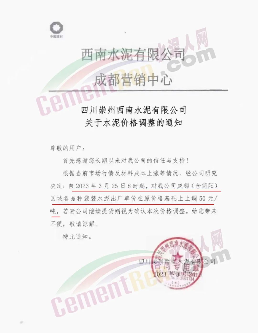 四川崇州西南水泥通知,根据当前市场行情及材料成本上涨等情况,经公司研究决定,自2023年3月25日8时起,对公司成都(含简阳)区域各品种袋装水泥出厂单价在原价格基础上上调50元/吨。