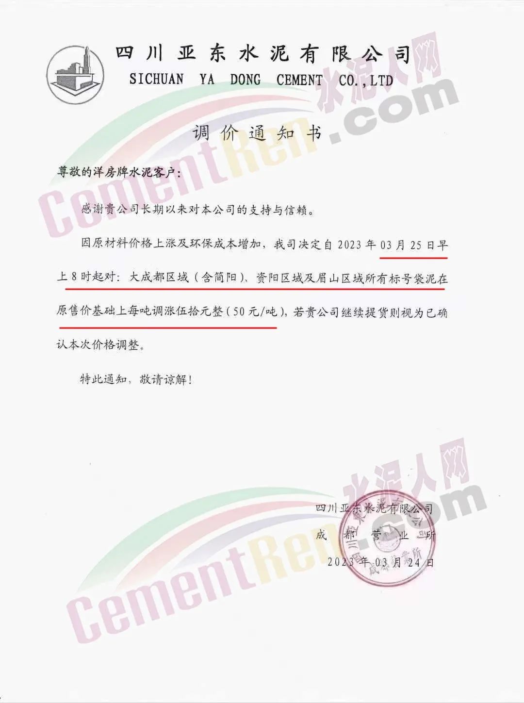 四川亚东水泥通知,因原材料价格上涨及环保成本增加,公司决定自2023年03月25日早上8时起,对大成都区域(含简阳)、资阳区域及眉山区域所有标号袋泥在原售价基础上每吨上调50元/吨。
