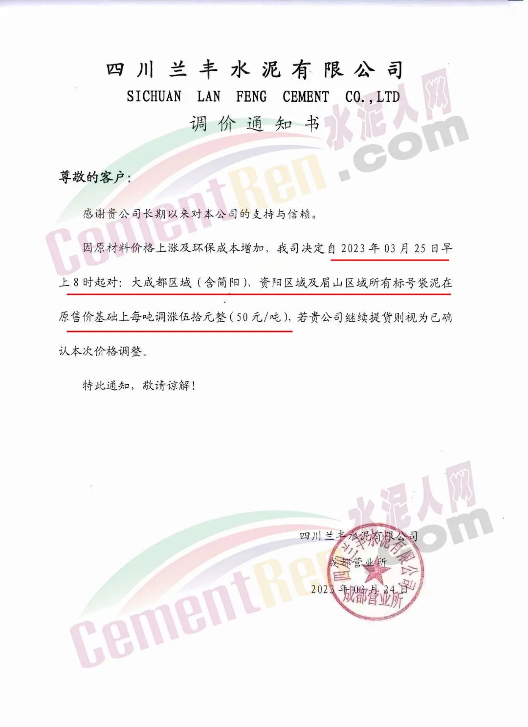 四川兰丰水泥有限公司通知因原材料价格上涨及环保成本增加,公司决定自2023年03月25日早上8时起,对大成都区域(含简阳)、资阳区域及眉山区域所有标号袋泥在原售价基础上每吨调涨50元/吨。