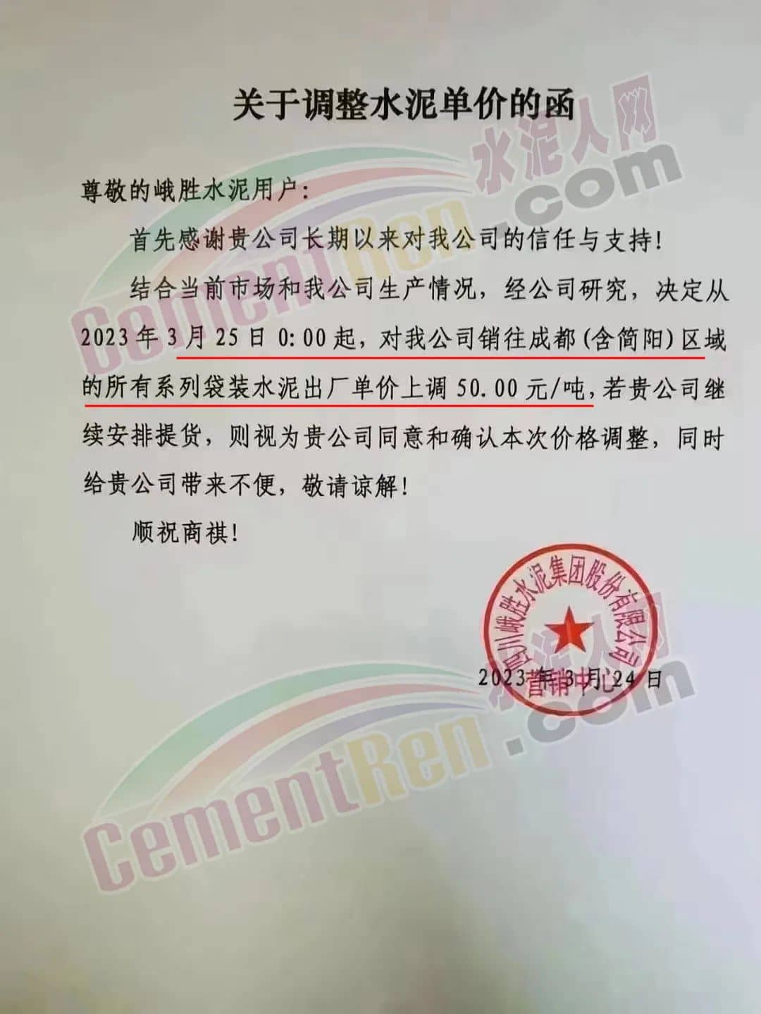 四川峨胜水泥集团股份有限公司通知,结合当前市场和公司生产情况,经公司研究,决定从2023年3月25日0:00起,对销往成都(含简阳)区域的所有系列袋装水泥出厂单价上调50.00元/吨