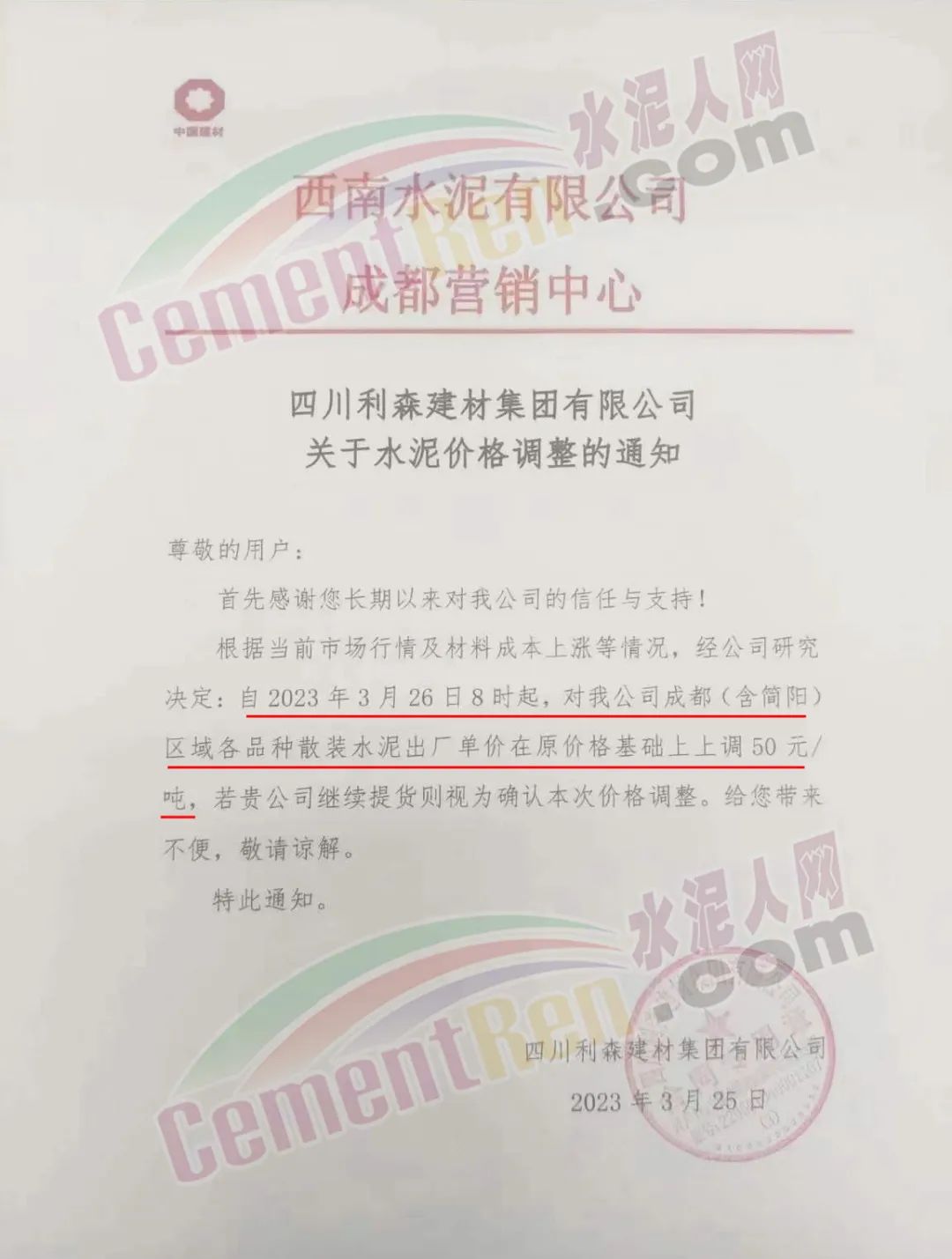 四川利森建材集团有限公司通知,结合当前市场和公司生产情况,经公司研究,决定从2023年3月25日0:00起,对销往成都(含简阳)区域的所有系列袋装水泥出厂单价上调50元/吨。
