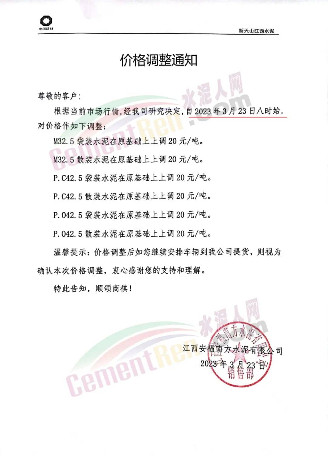 江西安福南方水泥有限公司通知,根据当前市场行情,经公司研究决定,自2023年3月23日八时对各标号水泥价格在原基础上上调20元/吨。