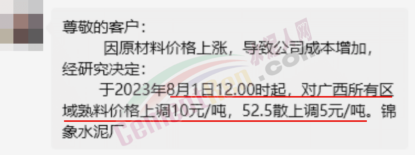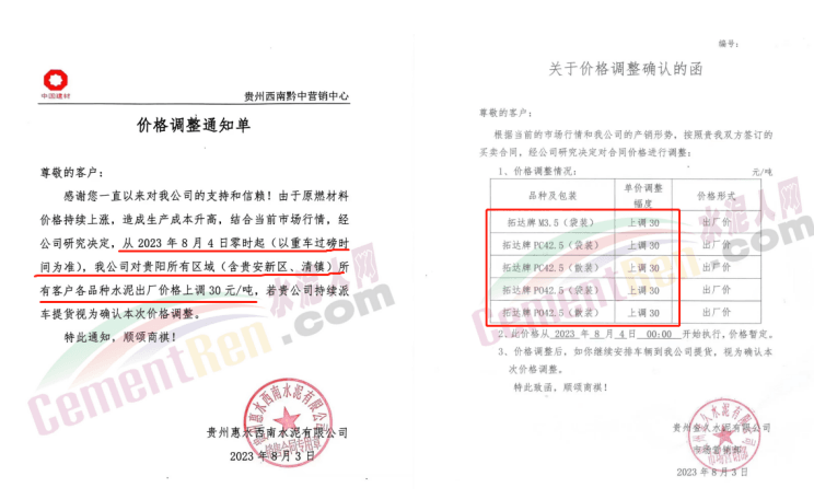 贵州区域,贵阳海螺盘江水泥有限责任公司、台泥(安顺)水泥有限公司、贵州紫云西南水泥有限公司、龙里红狮水泥有限公司、贵州麟山水泥有限责任公司、黔南州宏安建材有限公司、贵州惠水西南水泥有限公司、贵州金久水泥有限公司等10多家企业通知上调水泥报价30元/吨。